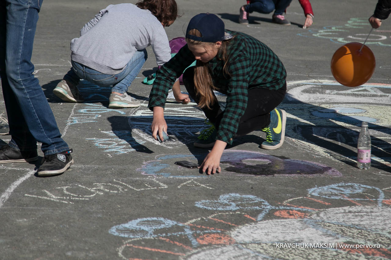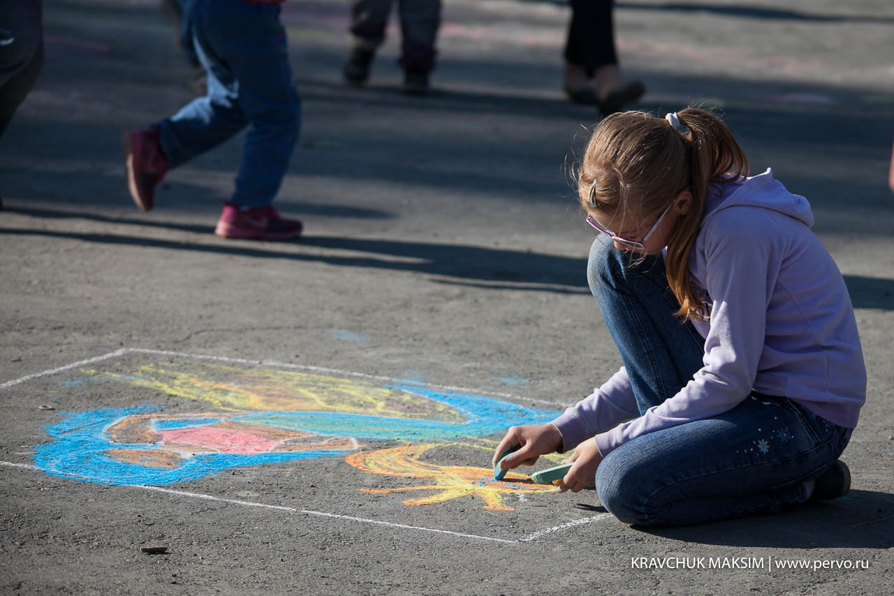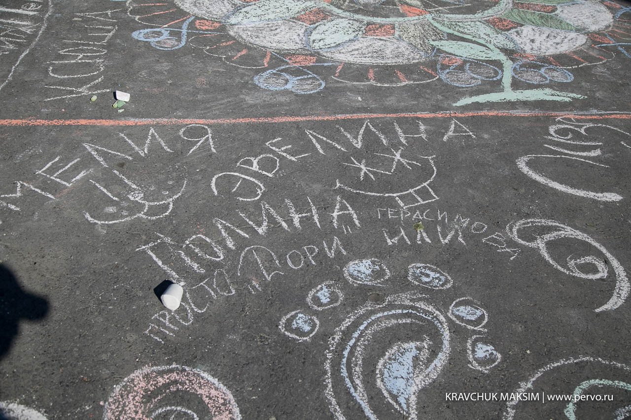 Одна из центральных площадок парка была подготовлена для конкурса рисунков на асфальте «Жизнь прекрасна», где юные художники рисовали семью, солнышко и героев из разных сказок.