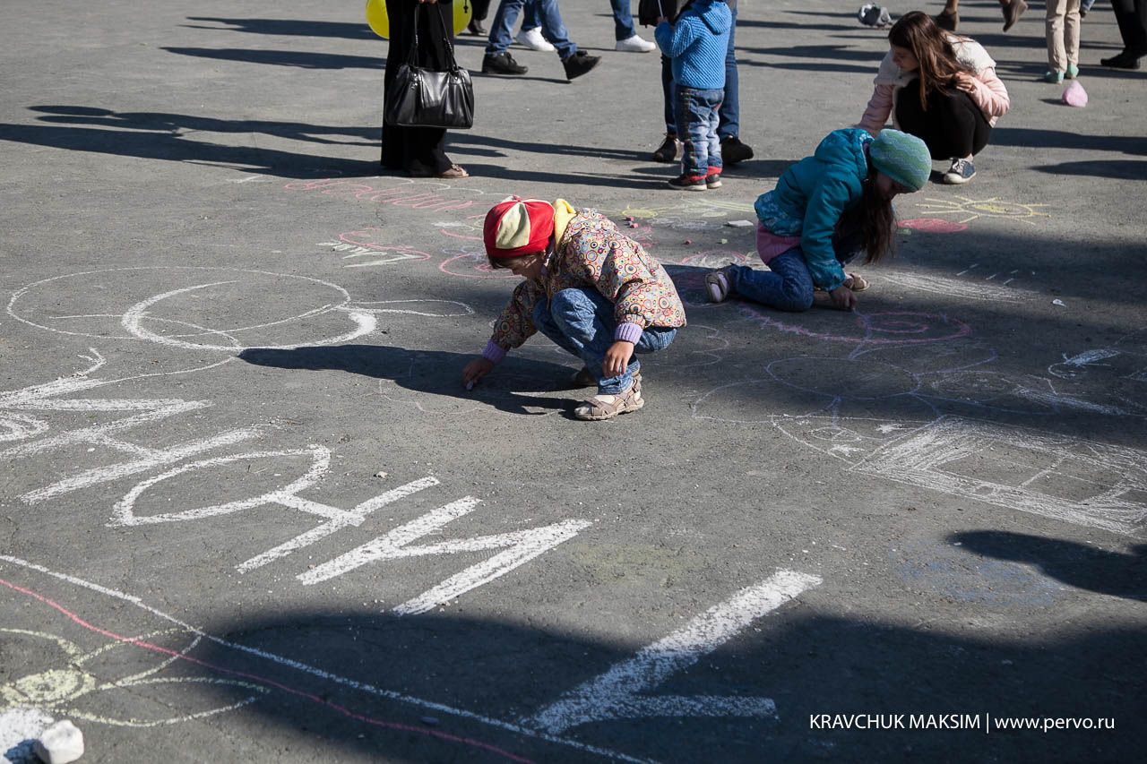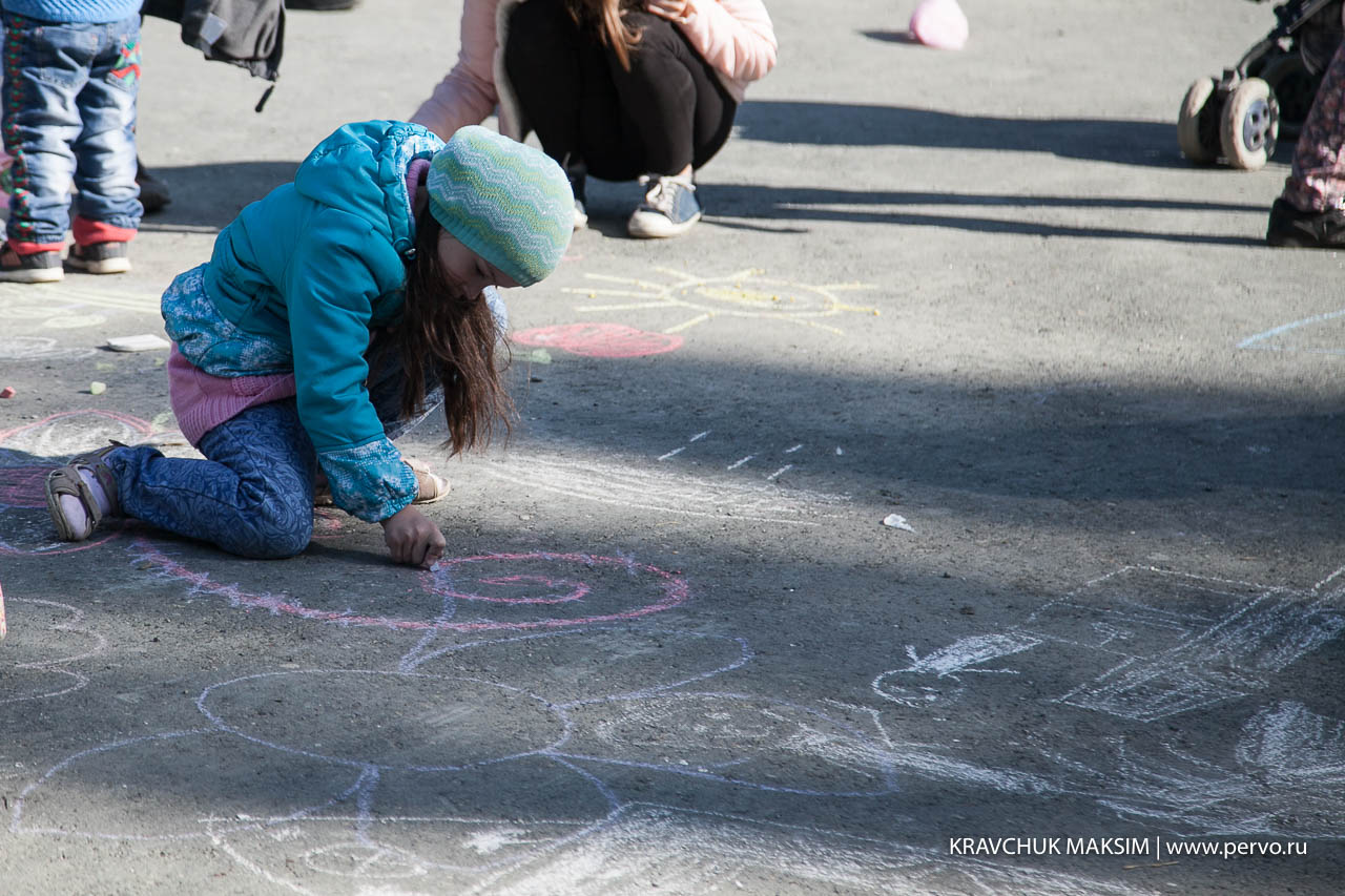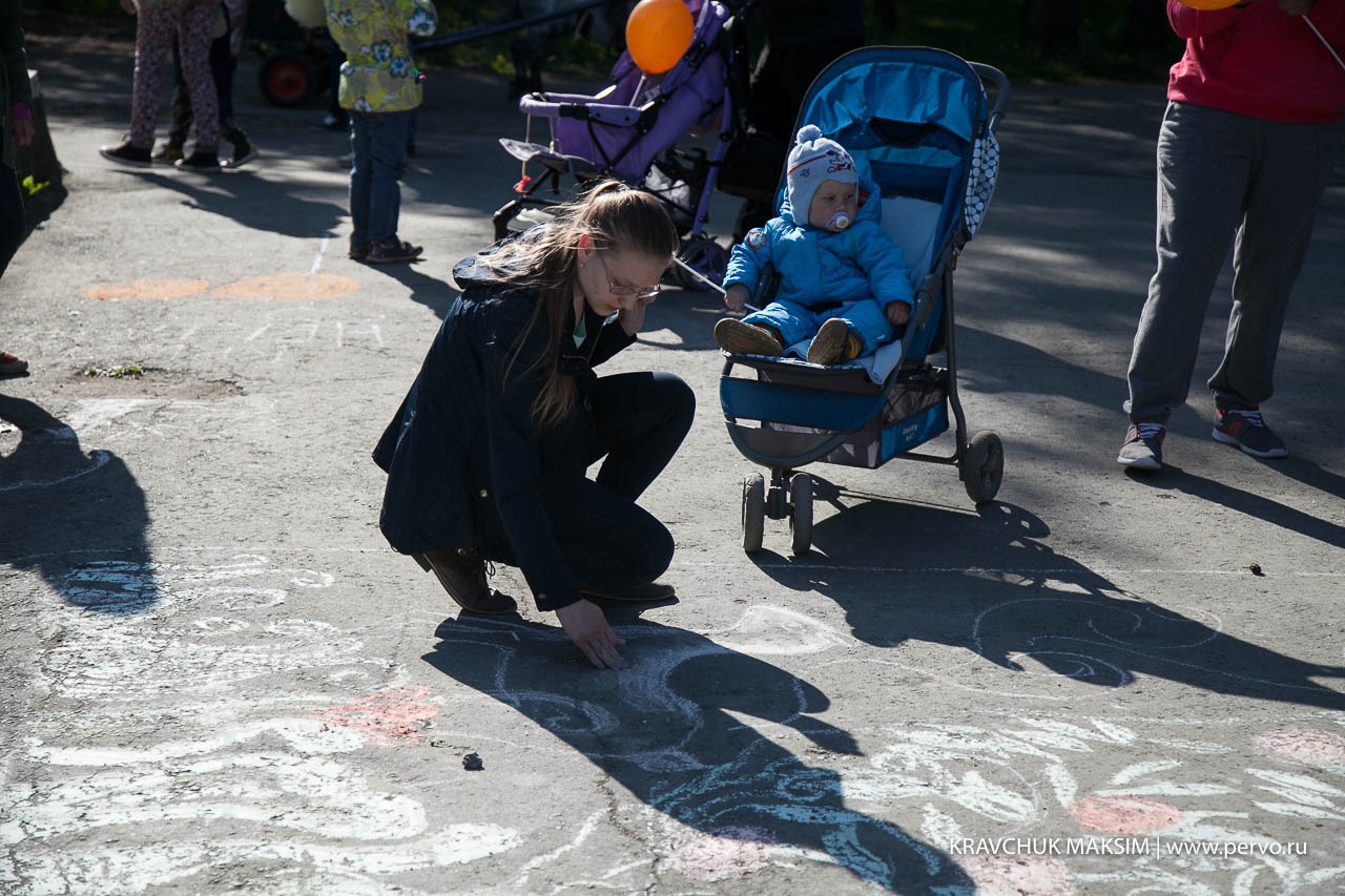 Одна из центральных площадок парка была подготовлена для конкурса рисунков на асфальте «Жизнь прекрасна», где юные художники рисовали семью, солнышко и героев из разных сказок.