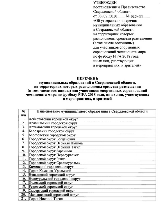 — Утвердить перечень муниципальных образований в Свердловской области, на территориях которых расположены средства размещения (в том числе гостиницы), для участников спортивных соревнований чемпионата мира по футболу FIFА 2018 года, иных лиц, участвующих в мероприятиях, и зрителей, – отмечается в документе, подписанном председателем правительства Денисом Паслером.