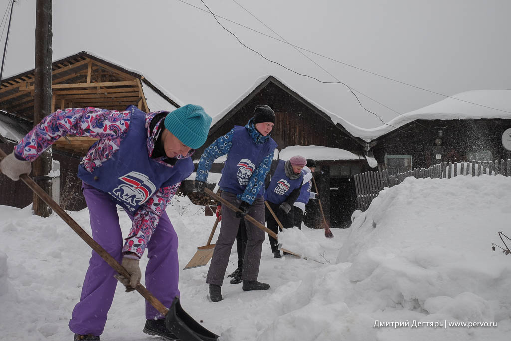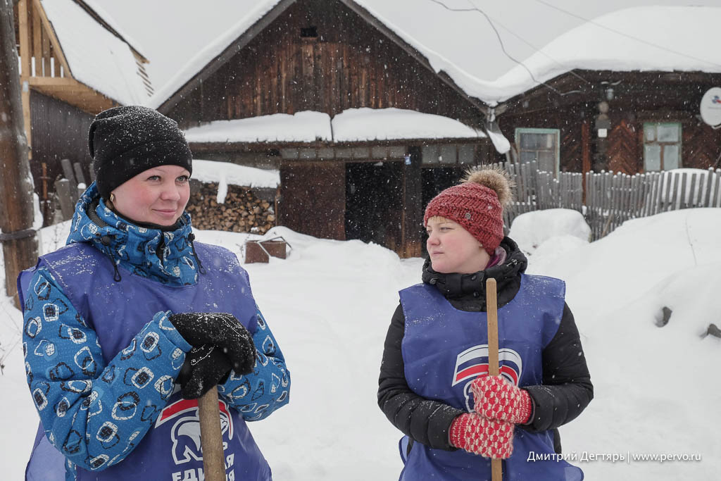 Татьяна Путинцева, дочь ветерана, определяет волонтерам фронт работ: ворота и двор нужно расчистить от снега, а фундамент наоборот - засыпать для тепла, убрать солому из клеток с кроликами и т.д.