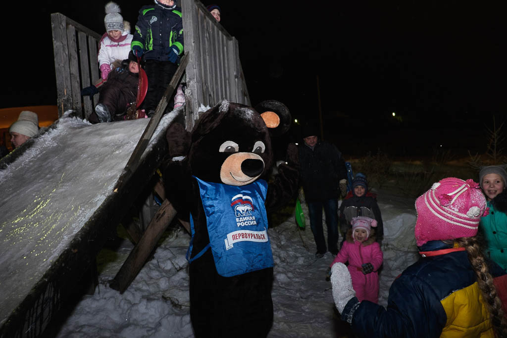 Несколько десятков малышей собралось вокруг елочки и ледяной горки на улице Панфилова. Ребятню встречали Дедушка Мороз с внучкой Снегурочкой и мишки «Единой России».