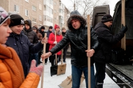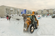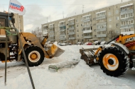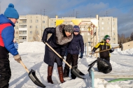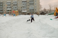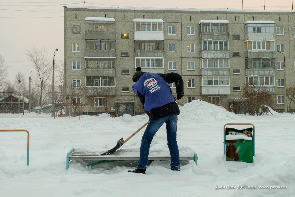 Детскую площадку очищают от снега: сугробы сгребает экскаватор, там, где большой ковш не проходит, подключаются активисты «Единой России» - вместе со студентами и членами местного отделения «Молодой гвардии» они буквально выкапывают из многосантиметровых сугробов спортивные сооружения, качели и горки.