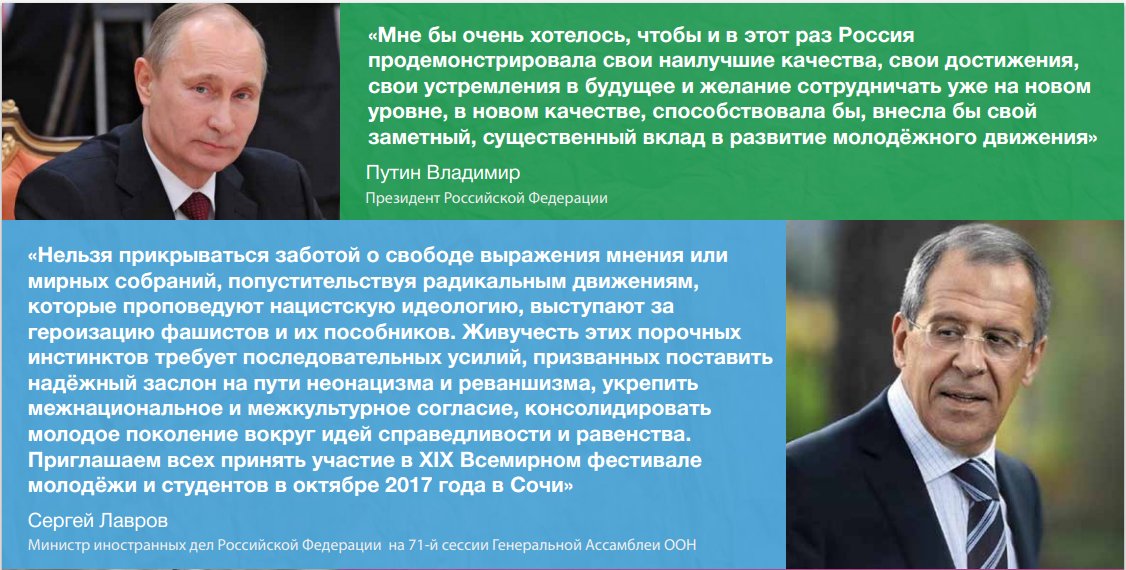 С 14 по 22 октября 2017 года в России в городе Сочи пройдет XIX Всемирный фестиваль молодежи и студентов.