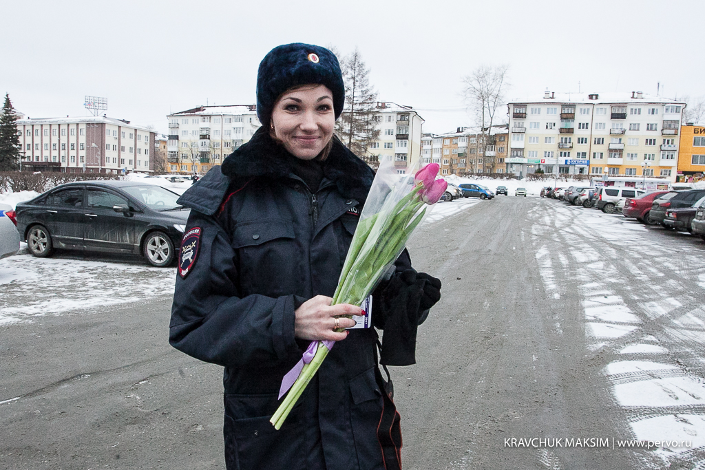 Каждый год в преддверии Международного женского дня на центральных улицах Первоуральска можно увидеть инспекторов ДПС ГИБДД, которые останавливают только женщин водителей. Причина остановки у них одна – поздравить прекрасных дам с замечательным праздником 8 Марта.