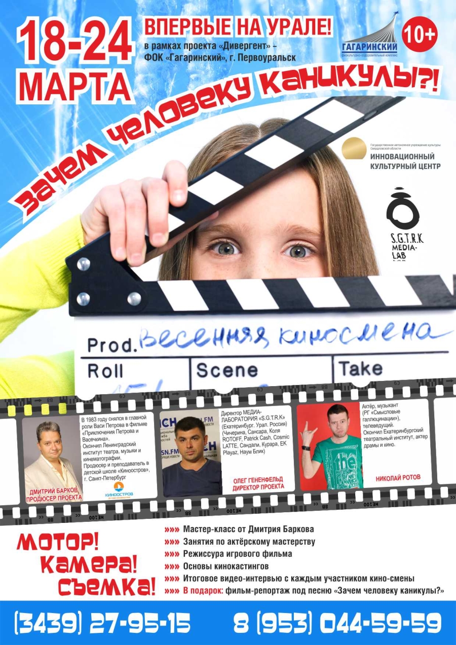 Инновационный культурный центр, при поддержке киношколы «Киноостров» город Санкт - Петербург и ФОК «Гагаринский» приглашают школьников 10-15 лет в профильные отряды творческого лагеря на уникальную кино - смену.