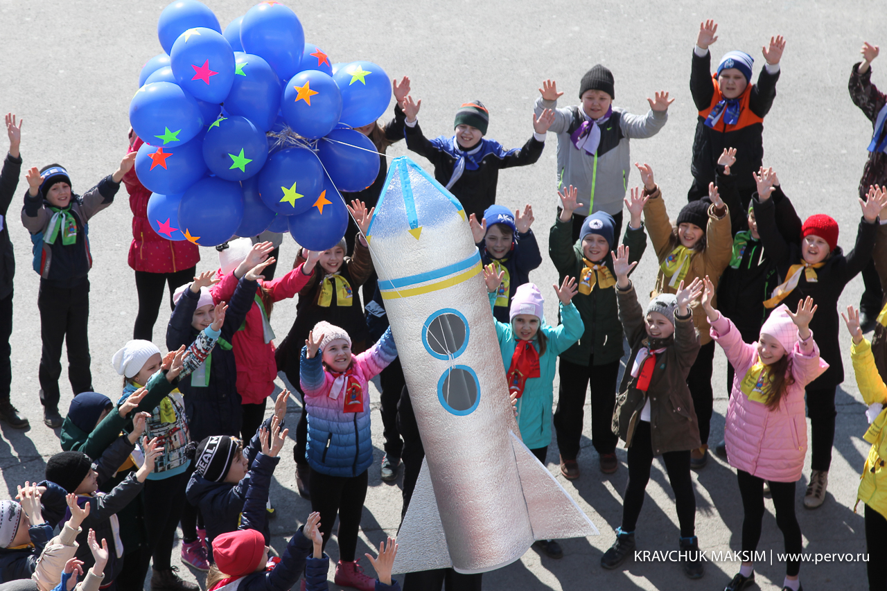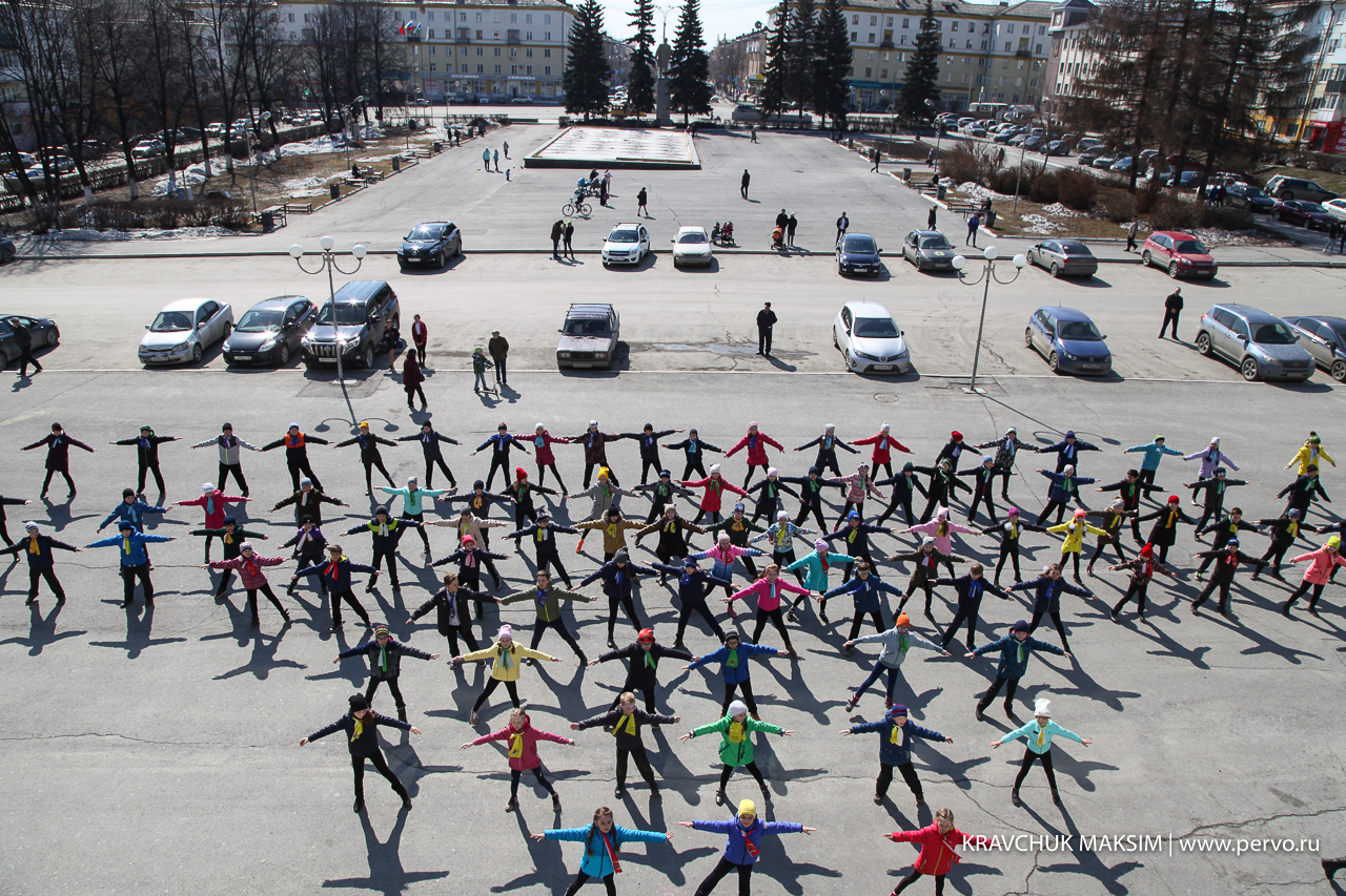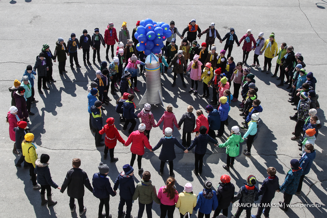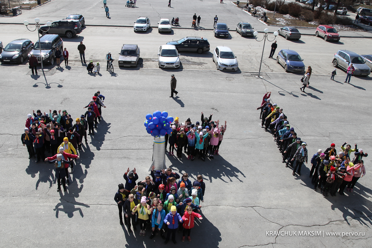 В этот день на центральной площади Первоуральска перед ДК ПНТЗ прошел танцевальный флеэшмоб, посвященный Дню Космонавтики. Под музыку «Время вперед!» 90 школьников запустили в небо ракету, сделанную своими руками. И, хотя выступление длилось всего 15 минут, ребята серьезно готовились к нему в течение нескольких недель.