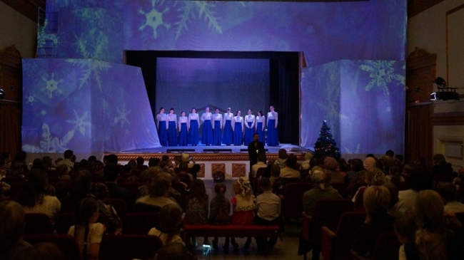 Благотворительная елка в драмтеатре Первоуральска открылась праздничным тропарем и рождественскими колядками в исполнении хора «Школьные годы» Первоуральской детской школы искусств под руководством педагога Натальи Сергеевны Кофман.
