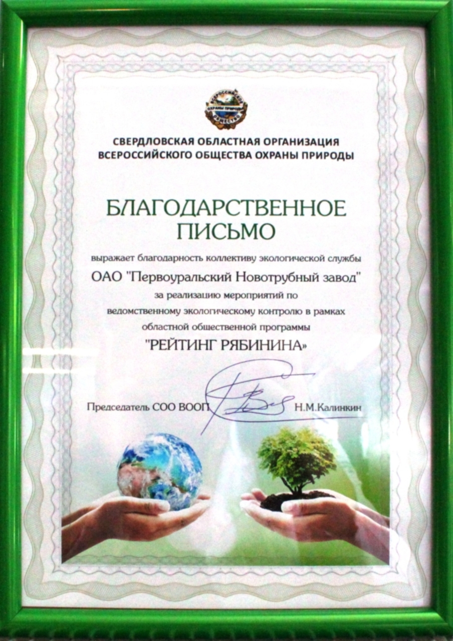Первоуральский новотрубный завод (ПНТЗ, входит в Группу ЧТПЗ) отмечен за реализацию мероприятий по ведомственному экологическому контролю в рамках областной общественной программы «Рейтинг Рябинина». Благодарственное письмо предприятию вручил заместитель председателя Свердловского отделения Всероссийского общества охраны природы Владимир Плюснин.