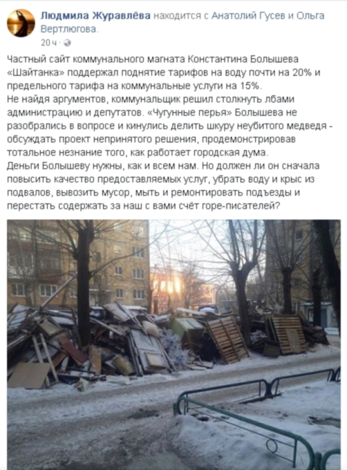 «Болышев пытается столкнуть лбами городскую думу и администрацию. Его сайт пошел на откровенную провокацию. Не разобравшись в вопросе, горе-писатели взялись обсуждать проект решения думы, которое еще не принято. На читателей вывалили имена и документы, не объясняя, что они значат. И показали тотальную некомпетентность и незнание того, как работает городская дума и как принимаются решения. Ясно одно: владелец сайта хочет, чтобы тарифы росли.