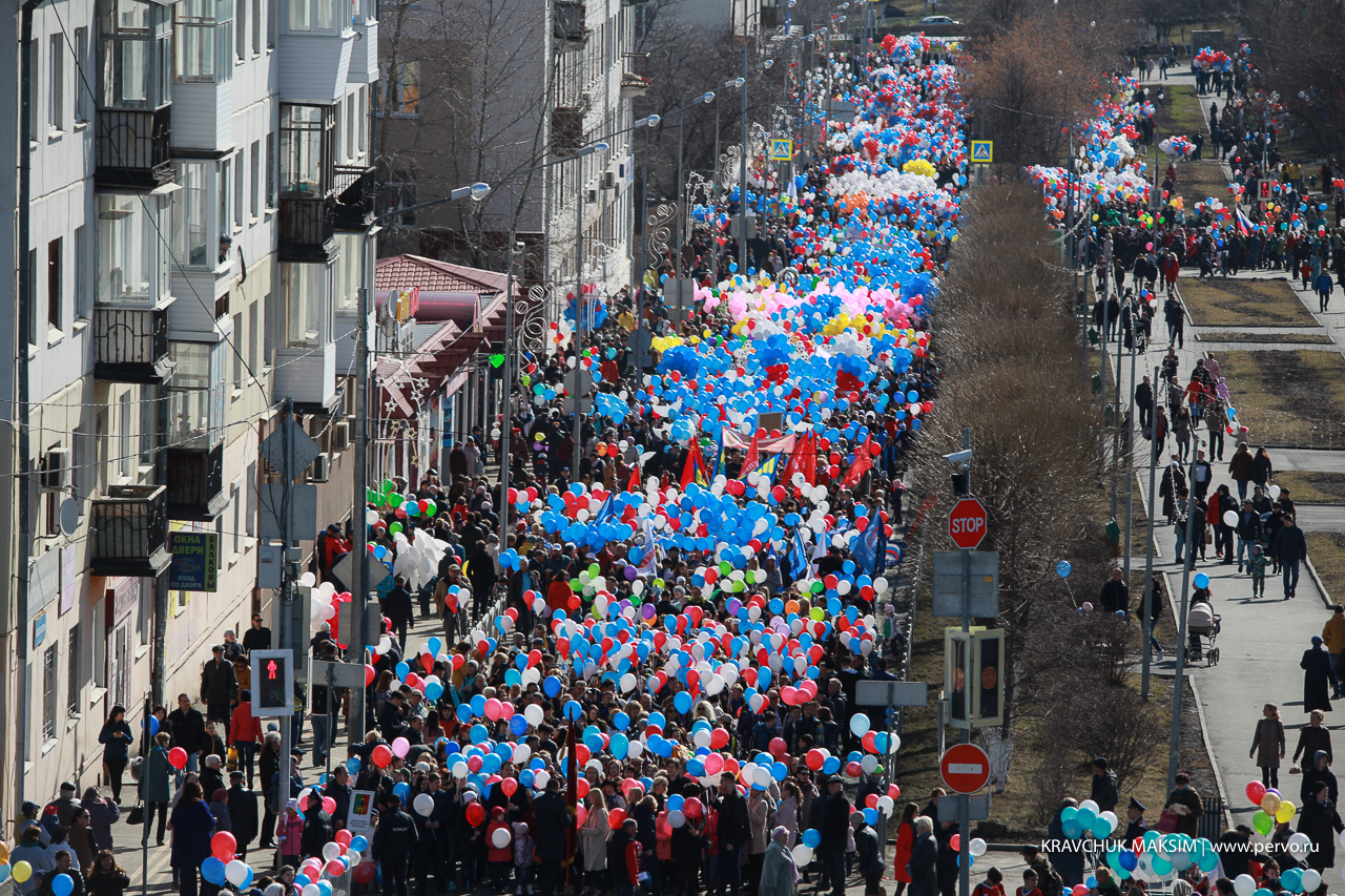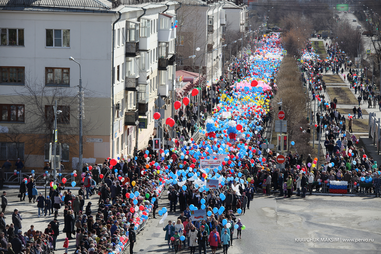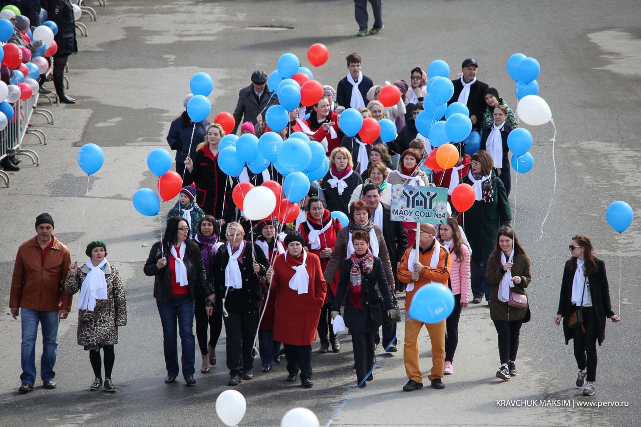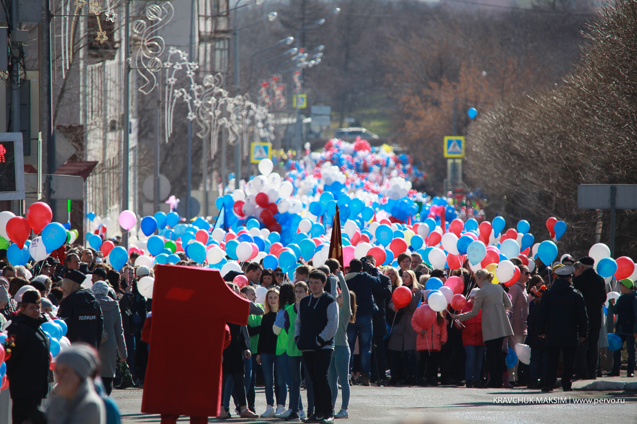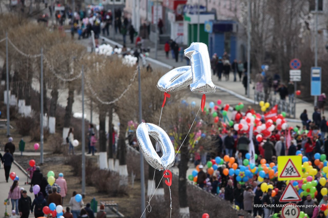 Под крики «УРА!», «Мир! Труд! Май!» и «Да здравствует Первомай» по центральной улице города, размахивая шарами и плакатами, самодельными и живыми цветами, прошли представители промышленных предприятий и заводов, вузов, школ и детских садов, политических партий, учреждений культуры и здравоохранения, предприятий сферы услуг.