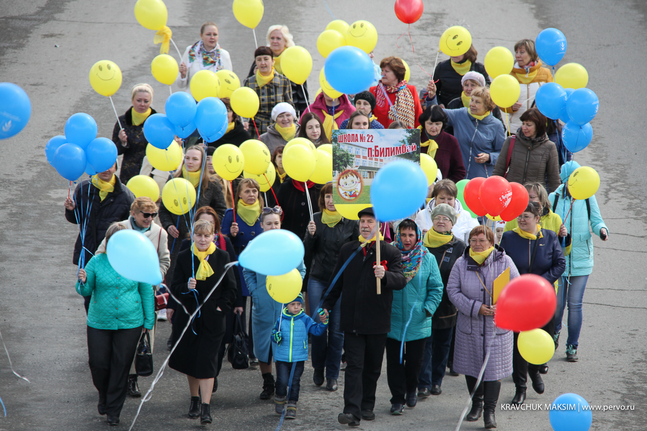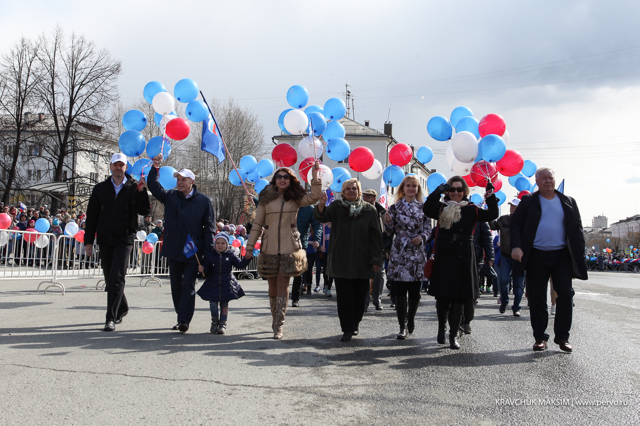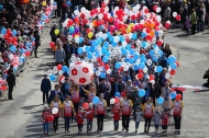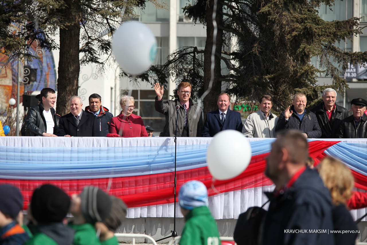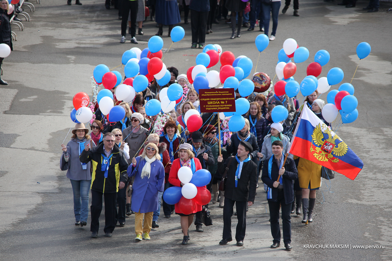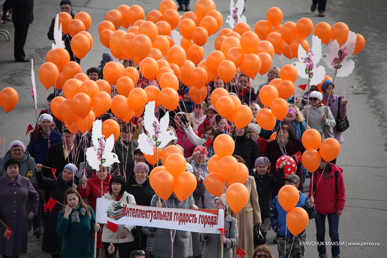 Под крики «УРА!», «Мир! Труд! Май!» и «Да здравствует Первомай» по центральной улице города, размахивая шарами и плакатами, самодельными и живыми цветами, прошли представители промышленных предприятий и заводов, вузов, школ и детских садов, политических партий, учреждений культуры и здравоохранения, предприятий сферы услуг.