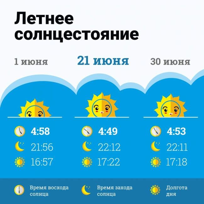 С днём солнцестояния не совпадают моменты самого позднего заката и самого раннего восхода Солнца. Самый поздний закат (22:11) будет 24 июня, а самый ранний восход (04:48) уже был 18 июня