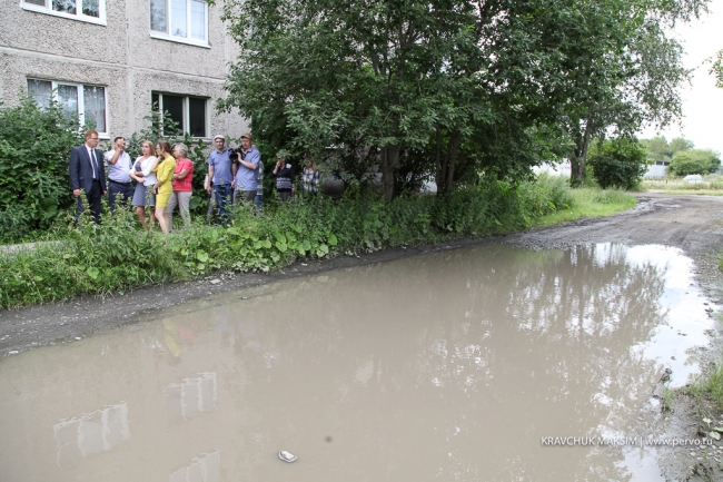 Не ходом, а вплавьДалее временно исполняющий полномочия главы едет на Корабельный проезд. По дороге вблизи придомовой территории домов №4 и №5 пешком просто так не пробраться. Место находится в низине, и на проезжей части постоянно скапливается вода, а вместе с ней и илистая грязь. Тротуар, который пролегает рядом, жители сами выкладывают досками и старой фанерой.