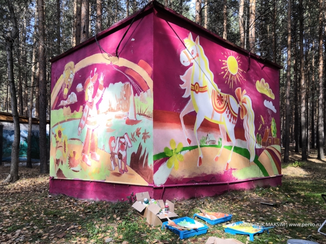 Педагоги и ученики первоуральской художественной школы, работая по эскизам, созданным преподавателем Сергеем Предеиным, изобразили на стенах будки лошадь и ребенка, беззаботно гуляющего с собакой.