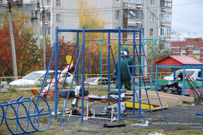 Детский комплекс состоит из горки, качели, «лазалки» и песочницы. Песок привезен из Южноуральска и соответствует всем санитарным нормам. Площадку изготовили в Санкт-Петербурге, она качественная, безопасная, соответствует ГОСТу. Рабочие ее будут устанавливать на протяжении дня, затем зальют цементом. Должны пройти сутки, прежде чем здесь смогут играть дети.