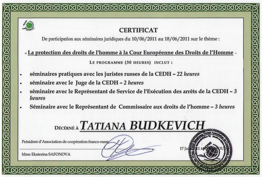 Именно по этой причине возник интерес к участию в программе по повышению квалификации адвокатов в Европейском суде по правам человека, организованной Ассоциацией франко-российского сотрудничества у Председателя Первоуральского местного отделения «Ассоциации юристов России» Татьяны Георгиевны Будкевич.
