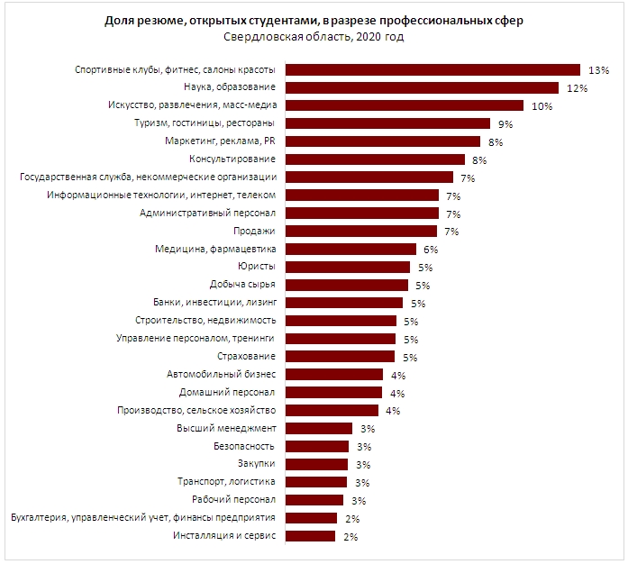 Самая популярная профессиональная сфера среди студентов – «Спортивные клубы, фитнес, салоны красоты», сразу 13% резюме здесь принадлежат учащимся вузов и ссузов. Такой вывод сделали аналитики hh.ru по поиску работы и сотрудников, изучив более 30 тысяч резюме студентов из Свердловской области и Первоуральска.
