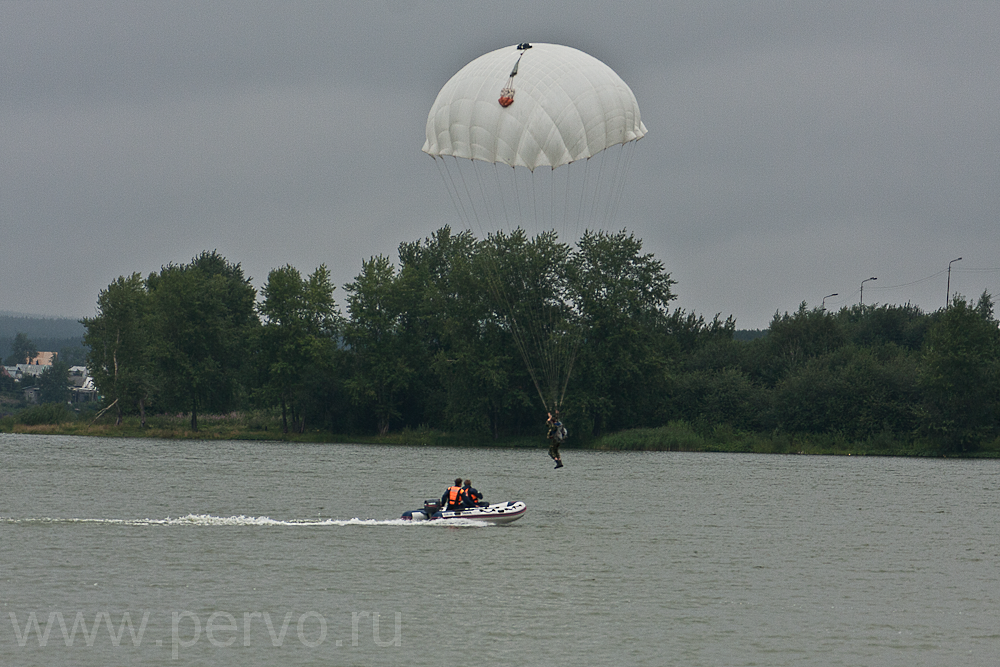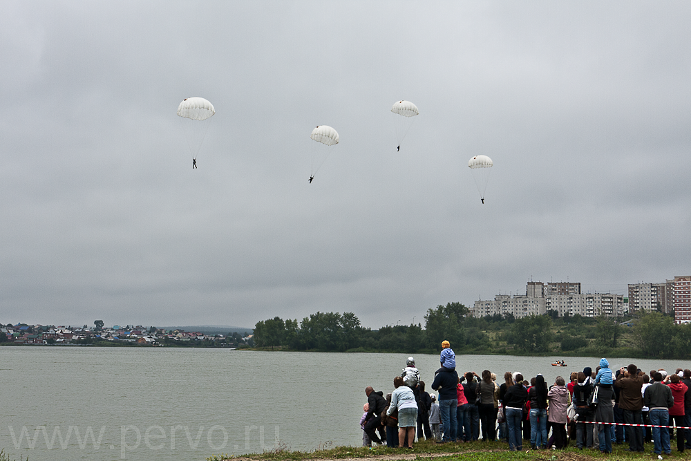 Кульминацией праздничного мероприятия стала высадка воздушно-морского эшелона морского десанта. Облачность не помешала группе, в которую вошли воспитанники первоуральского клуба "Саланг", морпехи из Екатеринбурга, десантники. Еще предполагалось, что тандем Владимир Исмагилов и Виктор Лысенко совершит прыжок на точность приземления.