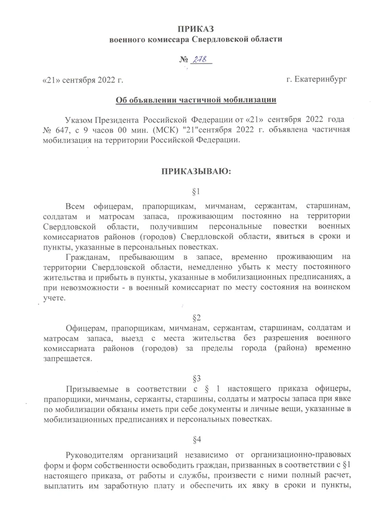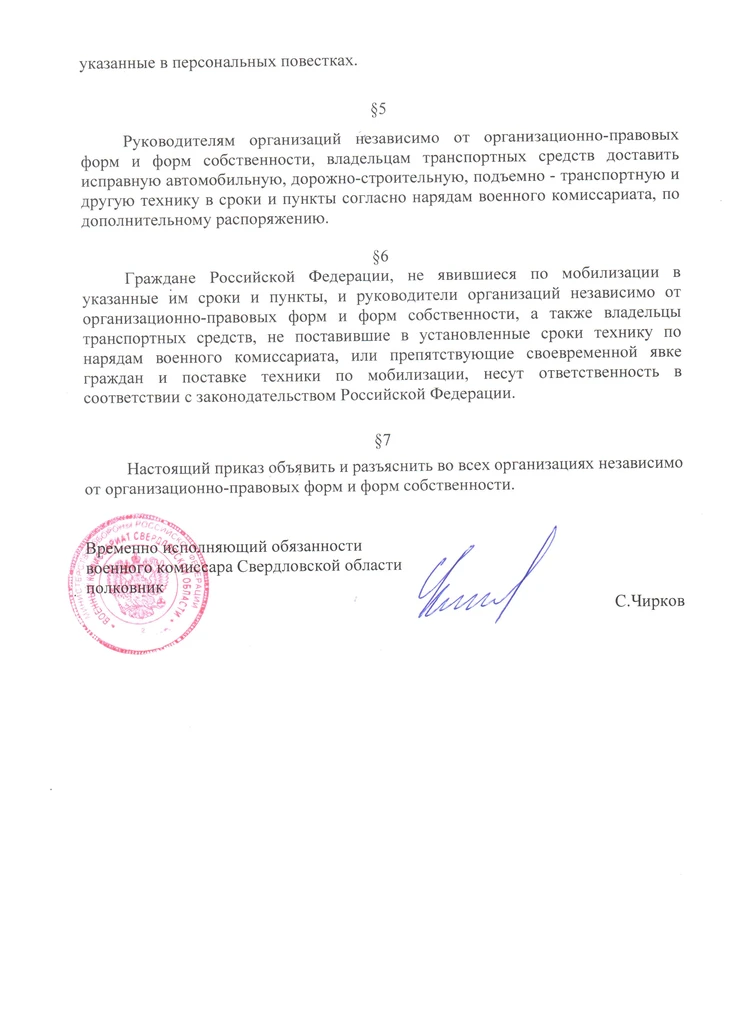 Временно исполняющий обязанности свердловского военного комиссара полковник Сергей Чирков выпустил приказ о мобилизации. Согласно документу, все, получившие повестки, должны явиться в военкомат с личными вещами и документами. Кроме этого, получившим повестки запрещается покидать место жительства без специального разрешения.