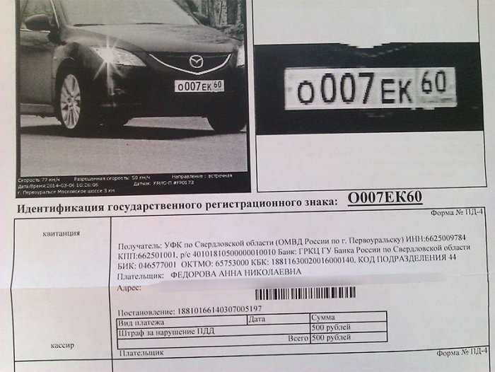 «20 марта я написала через интернет-приёмную жалобу в УГИБДД по Псковской области с требованием аннулировать штраф и принять меры по розыску и проверке водителя «машины-двойника». 24 марта мне пришел ответ, что моя жалоба направлена на рассмотрение в ГИБДД Первоуральска согласно ч.1 ст. 30.2 КоАП РФ», - продолжает рассказывать Анна. - Тем временем уведомление о штрафе пришло по почте. Каково же было моё удивление, когда я увидела на фото машину, снятую системой фотовидеофиксации. Это была Mazda 6 с госномером «О 007 ЕК 60 rus», действительно ранее принадлежавшая мне, но проданная 27 июня 2013 года. При это госномер при продаже был присвоен другому автомобилю другой марки, который теперь принадлежит мне. Это доказывает, что на Урале действительно ездит «машина-двойник». Теперь собираюсь писать жалобу непосредственно в УГИБДД Свердловской области с предоставлением копий договора купли-продажи ТС».
