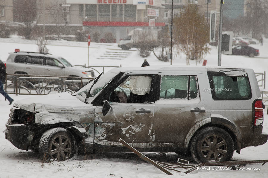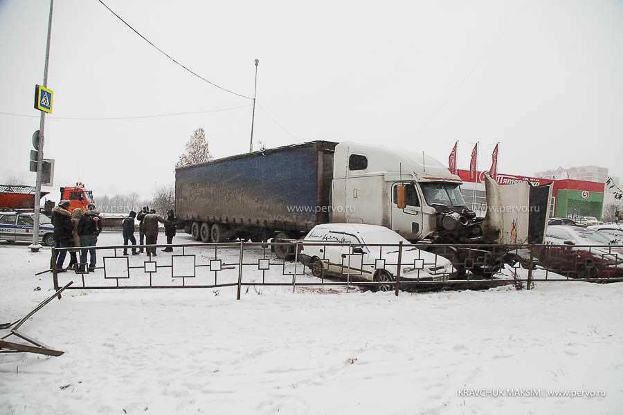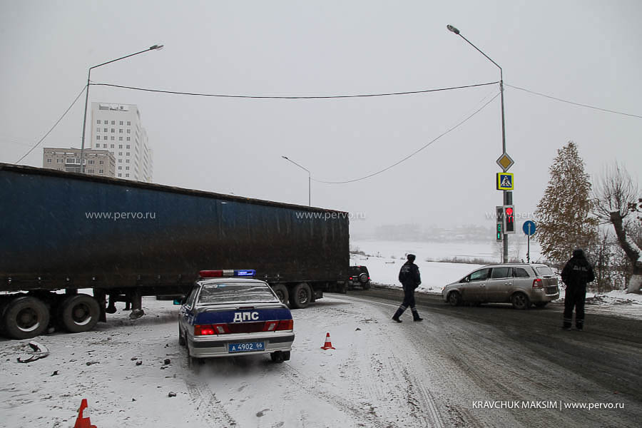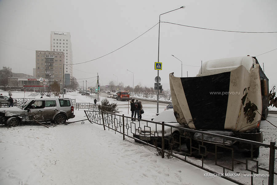 www.pervo.ru работники ГИБДД, работающие на месте происшествия, женщина-водитель на автомобили Range Rover выезжала от магазина «Пятерочка», в это время по главной дороге двигалась фура, по какой причине женщина решила не пропустить большегруз, женщина прокомментировать отказалась.