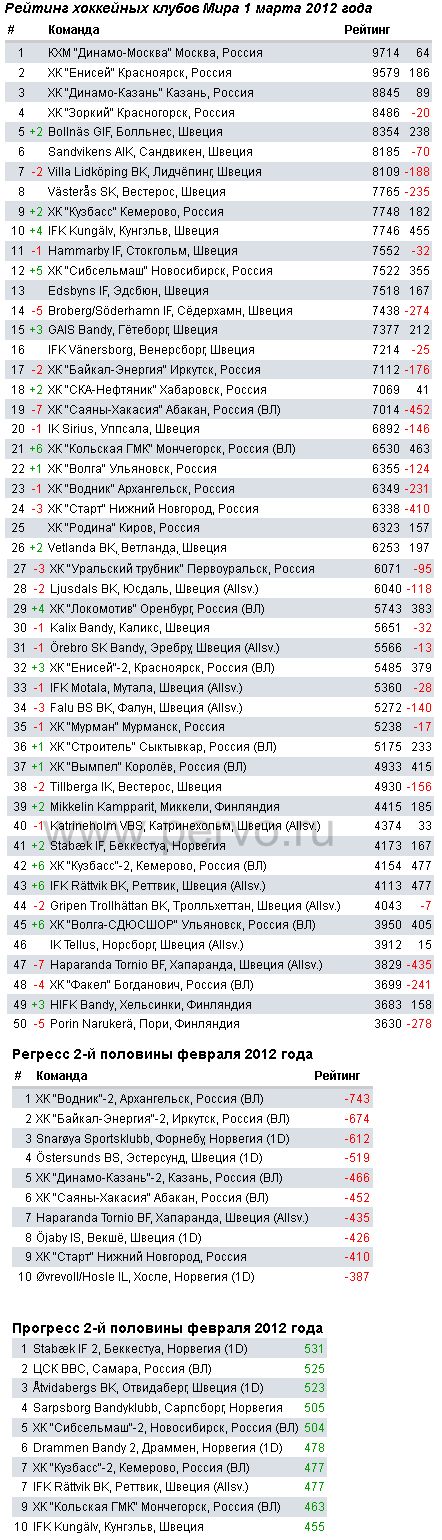 Хоккеисты «Саяны-Хакасии» хоть и одержали домашние победы во всех трёх матчах второй половины февраля – 7-3 с дублем «Байкала», 6-1 и 8-3 с дублем «Енисея» - однако не смогли удержать свою высочайшую домашнюю оценку, потеряли в сумме 452 рейтинговых балла и переместились с 12 на 19 место в списке лучших команд Мира.
