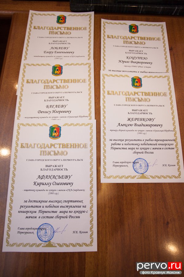 Чемпионы мира полузащитник Денис Багаев, защитник Кирилл Афанасьев и нападающий Егор Лобаев были награждены Почетными грамотами Главы городского округа Первоуральск и сертификатами хоккеистов.