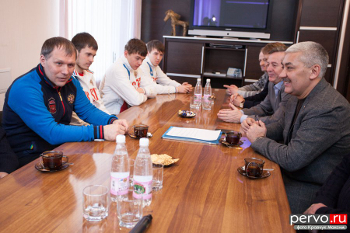 Поздравить ребят с победой в кабинет Николая Козлова пришли и легенды русского хоккея – Николай Дураков, семикратный чемпион мира, официально признанный лучшим хоккеистом страны ХХ века и Валентин Хардин, шестикратный чемпион СССР и четырехкратный чемпион мира.
