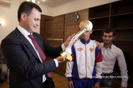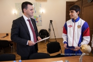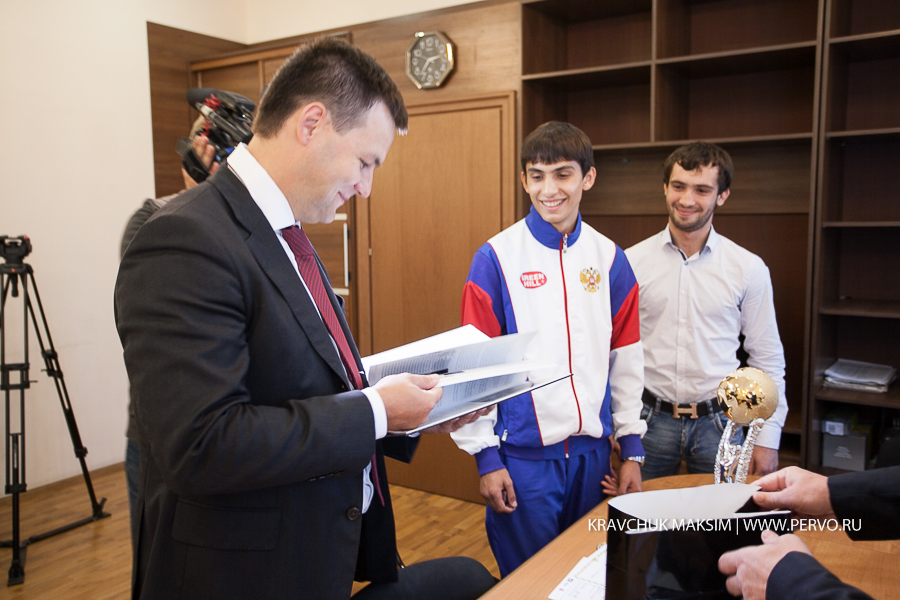 Алексей Дронов с искренним интересом пообщался с чемпионом мира и его тренером. Затем вручил Александру Борисову почетную грамоту главы администрации городского округа Первоуральск, заметив: