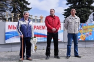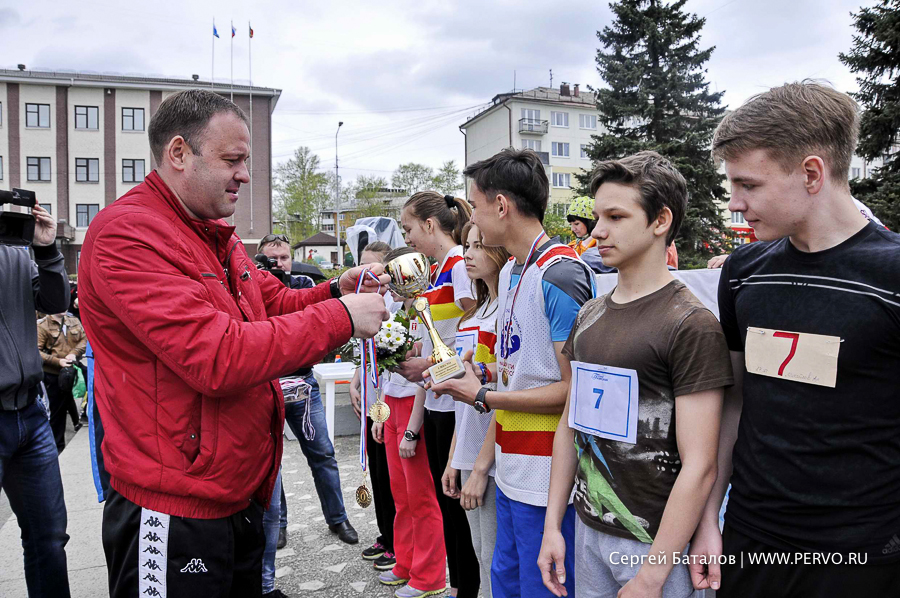 После такого скоростного начала пришел черед открывать эстафету. Участники соревнования построились в одну колонну и расположились на площади Победы. Спортсменов, их тренеров и болельщиков приветствовал олимпийский чемпион по конькобежному спорту Игорь Малков, заместитель начальника управления культуры, физической культуры и спорта. Также на трибуне был и почетный гость – фронтовик, судья и бессменный судья-информатор эстафеты на протяжении 54 лет Яков Митрофанович Багаев. Незадолго до соревнования, 14 мая, ему исполнилось 88 лет!
