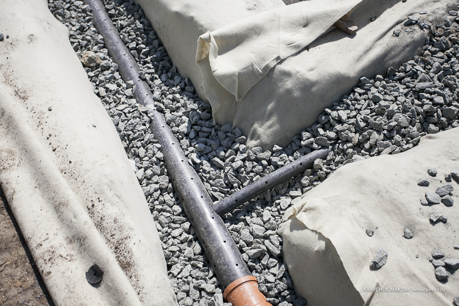 Что сделаноСтроительство искусственного футбольного поля подрядчик начал с подготовки котлована — выемки грунта на указанную в проекте глубину. Затем были проведены дренажные работы, после этого на на дно котлована были помещены дренажные трубы, через которые будет уходить вода.
