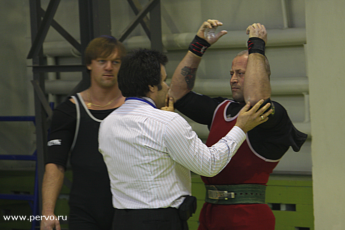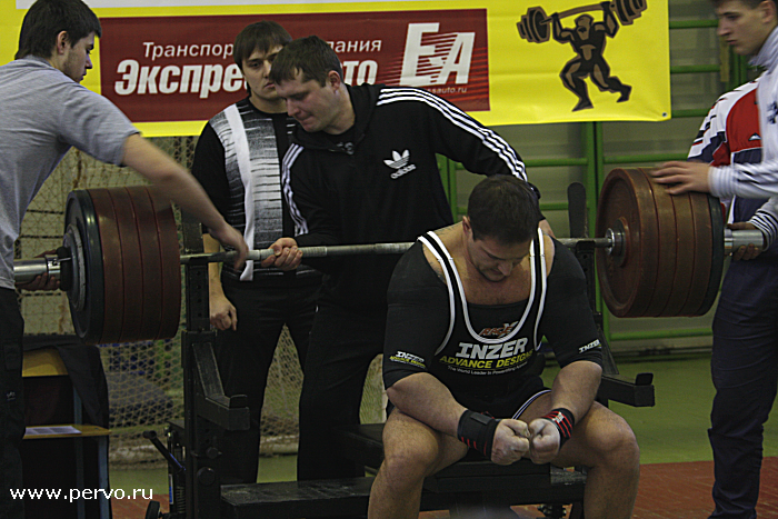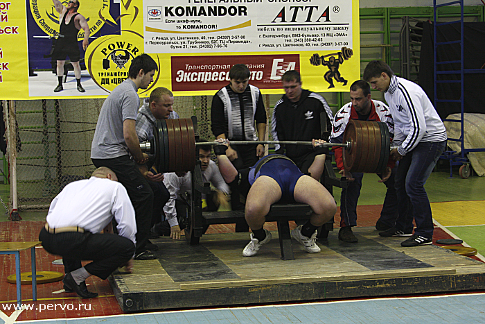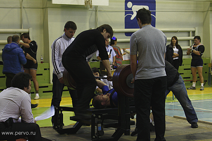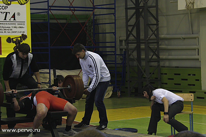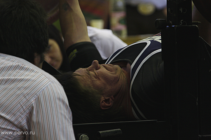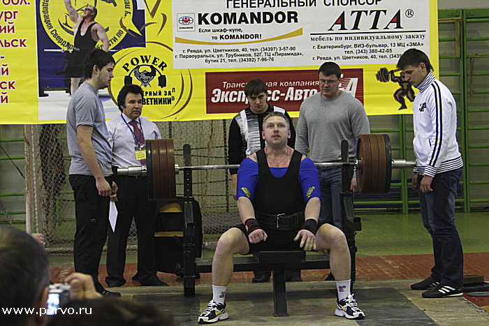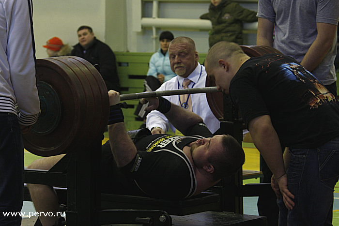 В жиме лежа в экипировке победил Николай Пышминцев (г. Каменск-Уральский) 332,5 кг, при собственном весе 122 кг.