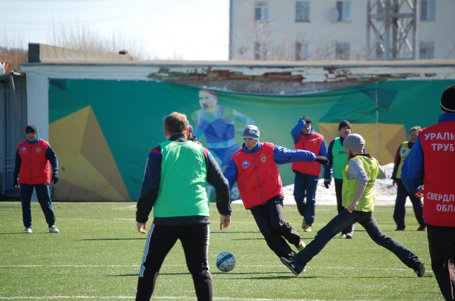Первый тайм матча прошёл с большим преимуществом «Уральского трубника», практически не выпускавшего соперника с их половины поля. Голкипер болельщиков, а по совместительству – бухгалтер клуба Сергей Волкоморов трудился в поте лица. Первый пропущенный им мяч, правда, неберущимся не назовёшь, но затем он выручал партнёров неоднократно. В одном из эпизодов, согнув ногу в колене, он пяткой отбил мяч, летевший в ворота после удара Сергея Почкунова. При этом он даже не смотрел на бьющего! К перерыву трубники вели – 2:0 (отличились Дмитрий Черных и Денис Матвеев, сын известного в прошлом игрока команды Владимира Матвеева).