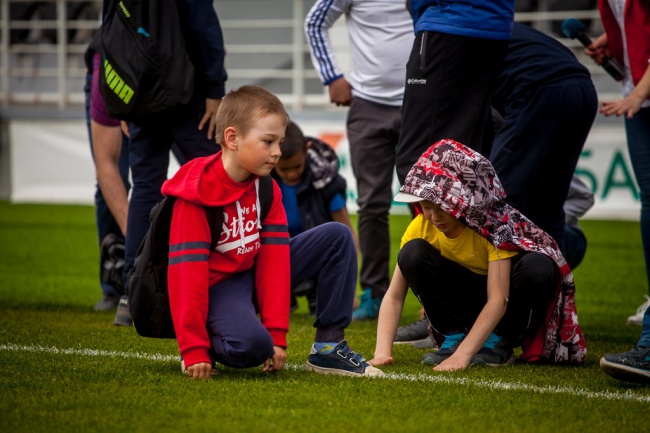 Экскурсия по стадиону началась с фанатского сектора. Мальчишки подобно настоящим болельщикам поскандировали кричалки с верхних трибун, а потом спустились к полю. Здесь им показали технику, которая используется в работе гринкипера.