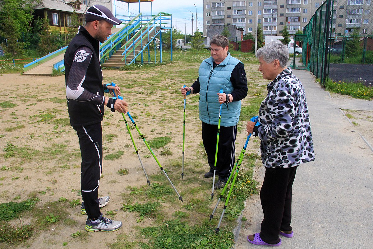Как раз на это время назначены спортивные занятия по скандинавской ходьбе, которые проводит общественная организация «Первоуральск – город чемпионов». Постепенно к активистам, которые выдают всем желающим палки для скандинавской ходьбы, подходят подтянутые женщины в кроссовках и повязках. Некоторые спортсменки приходят уже со своими палками — это значит, что они отходили 10 занятий и инвентарь им был подарен в качестве мотивации – заниматься дальше.