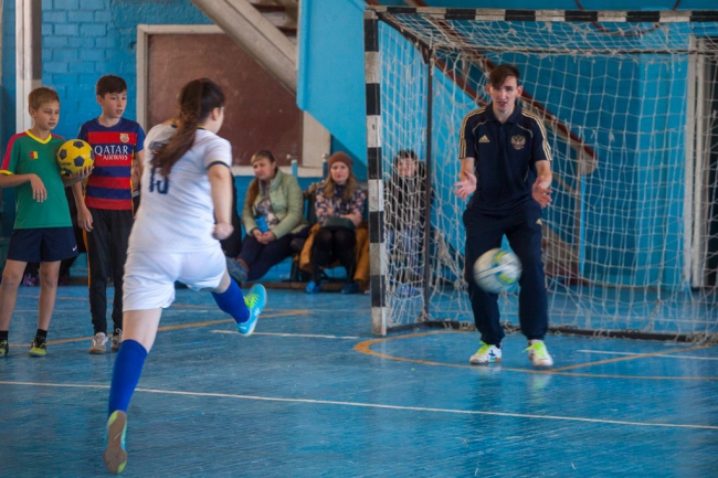 Ребята вместе с футболистом разминали мышцы, выполняли различные упражнения в виде эстафеты. Часовая тренировка заставила молодежь изрядно попотеть: объяснение, показ, отработка движения. Главное, убежден спортсмен, разбудить в ребятах энтузиазм.