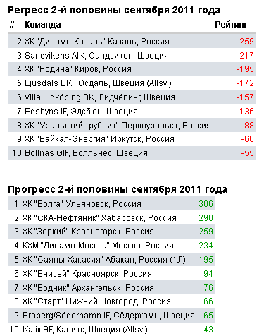 Итак, после матчей второй половины сентября, в итоговом рейтинге можно отметить следующие изменения: Обладатель Чемпионского Кубка, красногорский «Зоркий», сдвинул на одну ступень вниз сразу и «Динамо-Казань» и «Болльнес», водрузившись, таким образом на 3 строку мирового рейтинга!
