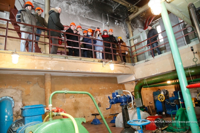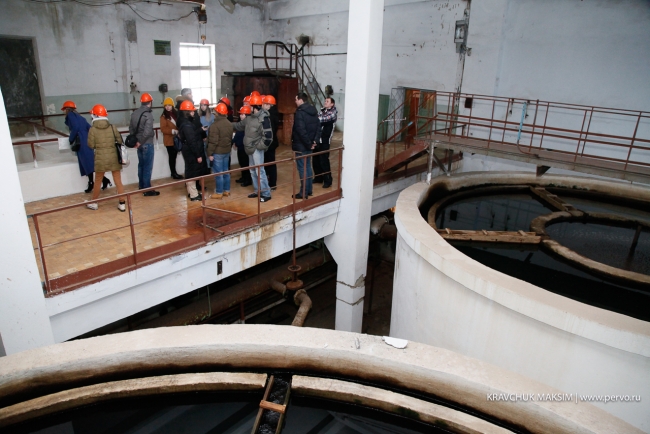 В зале фильтров старой фильтровальной станции, куда подается вода, участников экскурсии поразили масштабы резервуаров, откуда вода уже подается в город.