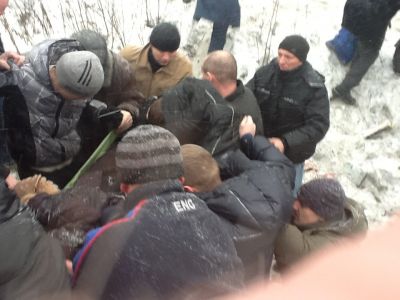 Пожарные с помощью специнструмента произвели деблокировку пострадавшего мужчины из поврежденного автобуса.