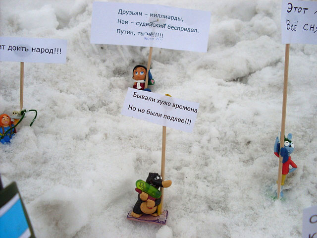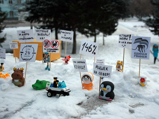 В роли "демонстрантов" с плакатами выступили фигурки из конструктора Lego, "киндер-сюрпризов" и другие игрушки. Их выстроили в сугробе, прикрепив к ним транспаранты с лозунгами.