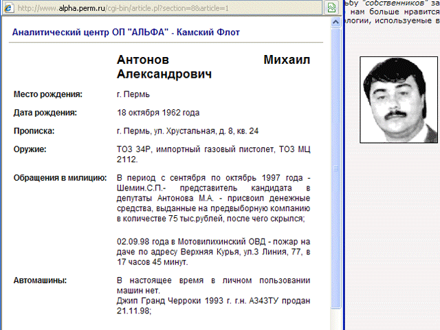Пермский портал 59.ru публикует солидную справку о личности Михаила Антонова. 46-летний коренной пермяк Михаил Антонов, как и большинство его коллег-бизнесменов, предпочитает оставаться в тени, несмотря на свое состояние. Он обладает обширными знакомствами в самых различных слоях общества. На имя Михаила Антонова официально зарегистрировано три пистолета, отмечает издание.
