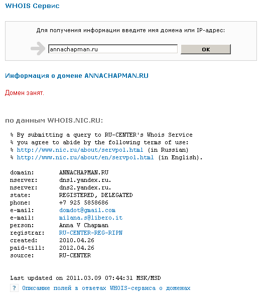 В регистре доменов зоны RU, в разделе Whois Service, в строке created (создано) указано, что сайт annachapman.ru зарегистрирован 26 апреля 2010 года. Шпионский скандал с провалом случился в конце июня 2010 года. То есть получается, что сайт, который используется для медийной и политической раскрутки разведчицы, был зарегистрирован за 2 месяца до ее громкого провала.