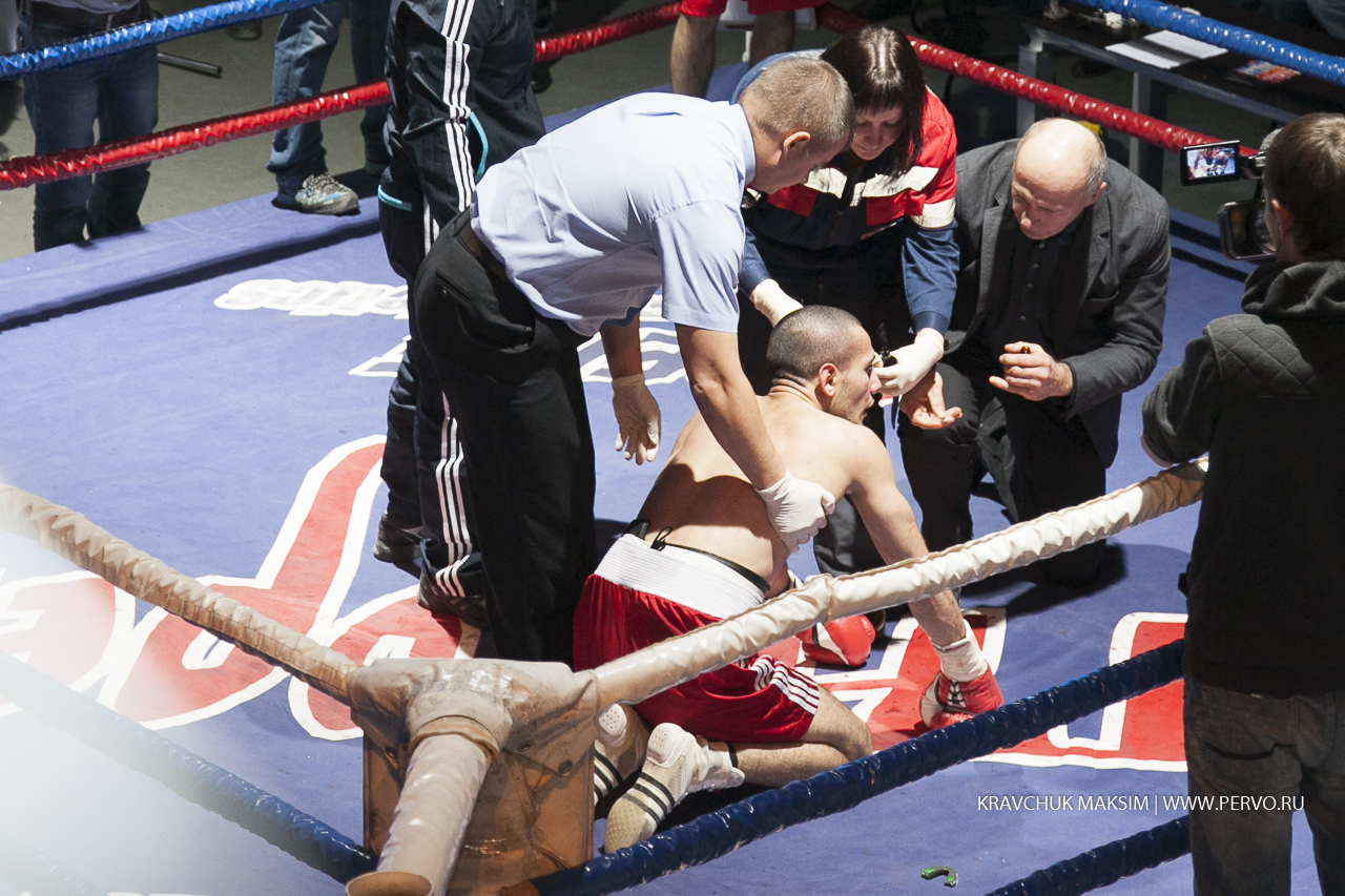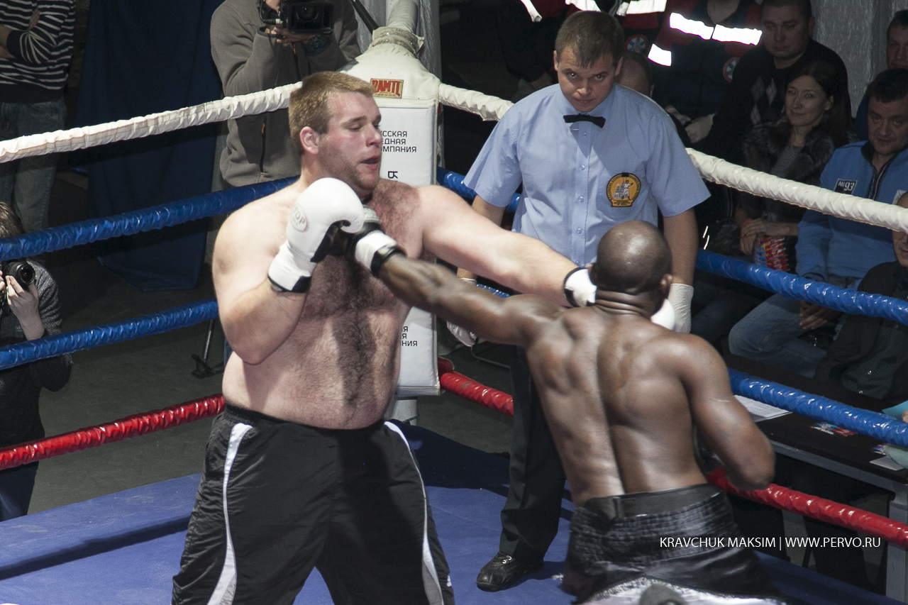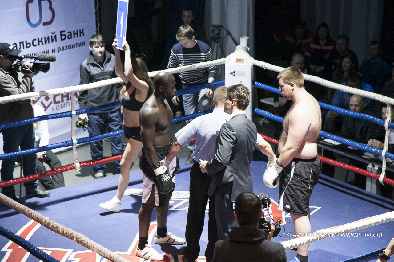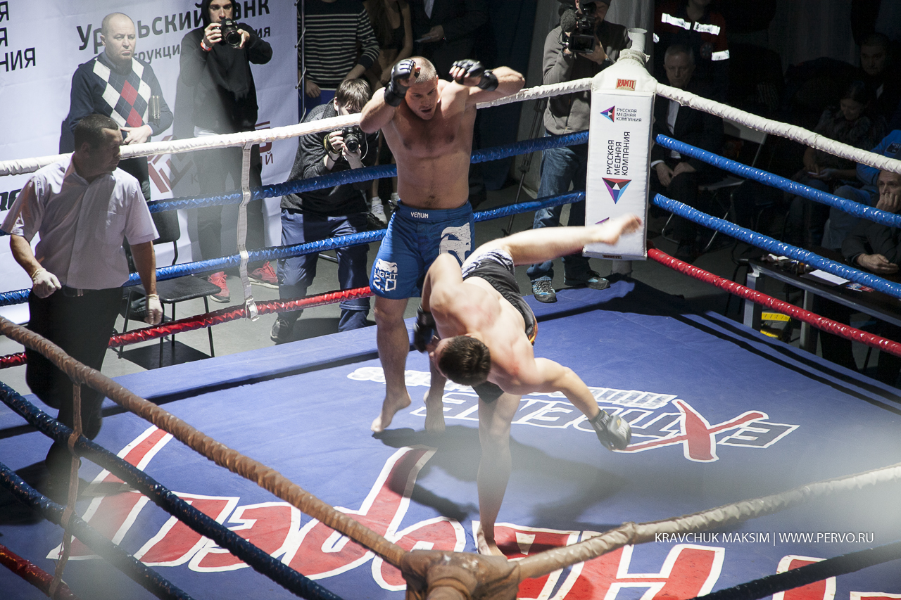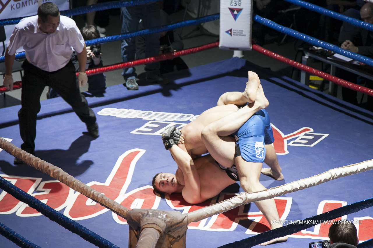 Один из боев проходит по правилам ММА. Здесь разрешены удары ногами, болевые и удушающие приемы. Вес противников свыше 95 килограммов. Борец из Магнитогорска Чемпион Европы Николай Рачек оступился и упал, тем самым дал возможность своему сопернику Чемпиону России по самбо из Екатеринбурга Ивану Штыкову сделать болевой прием и проиграл бой.